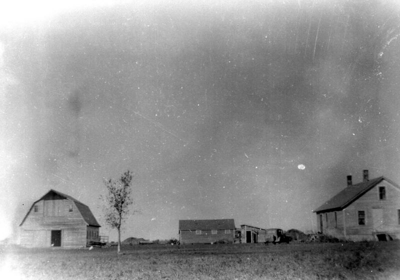 A very old photo of a farmstead, as viewed from the road.