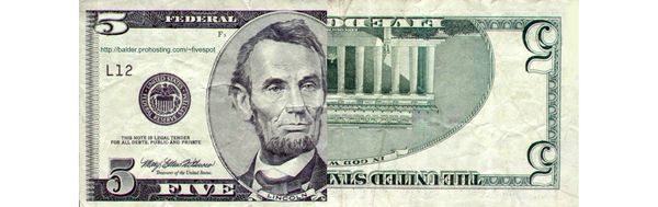 Next: Print out the Fivespot. The image itself is 8" wide, with the 6" bill in the center. This is done so it can be printed by most graphics software. If you print it out, portrait, and set it to "fit to page", it should come out fine. I've tested it with Wang/Kodak Imaging (which came with most Windows 95 installations, and I believe it's standard on Windows 98). If not, use whatever your favorite graphics program that you're comfortable with. Even try loading it in your webbrowser of choice and try printing it fron there. There are so many ways to print out a graphic, I can't explain them all here. If you're not sure, print it and get out a ruler - as long as it's close to 6 inches, give or take, it should be fine. if it's too big or two small, it won't be convincing. Try it out a couple times until you get it right. Once you got it printed out, cut the white away, around the outside of the image. Print out a whole bunch -- you're going to need to do more than one.